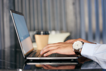 Hands, laptop and person typing architect project proposal or budget for financial profit or writing an email online. Internet, research and worker or employee working and search the web or website