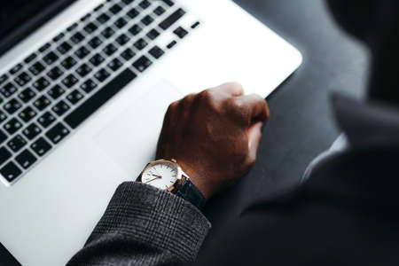 View from above. The hand of an African American man with an expensive Swiss watch, in a gray classic jacket, on a laptop. Style and business concept