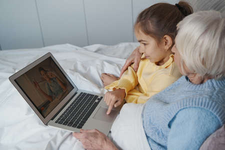 Smart child exploring medical solutions for her grandma online