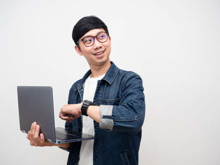 Young businessman glasses holding laptop show watch smile looking copy space