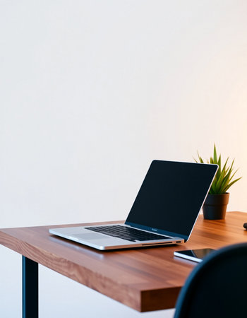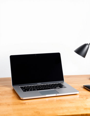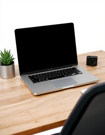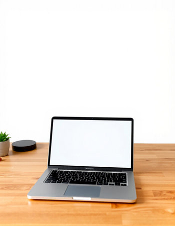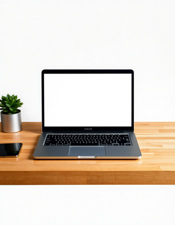 Laptop with blank screen on a wooden desk in a modern office