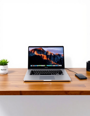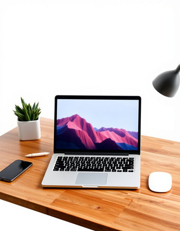 Laptop on wooden desk with mountain view and office accessories on white background