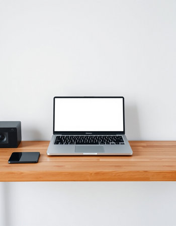 Laptop with blank screen on wooden table and speaker on white wall background