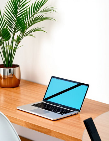 Laptop on wooden table with white wall background and plant pot.