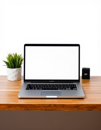 Laptop with blank screen on wooden table with smartphone and plant on white background