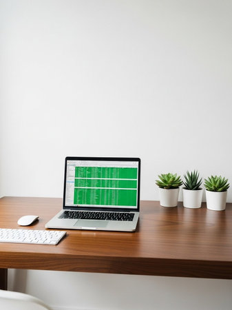 Laptop with green screen on wooden desk in office, stock photo