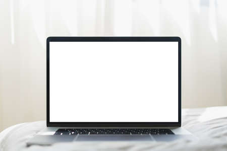 Mock up Blank screen laptop on the bed for advertising and text.