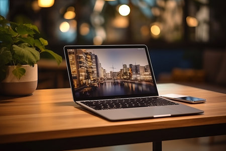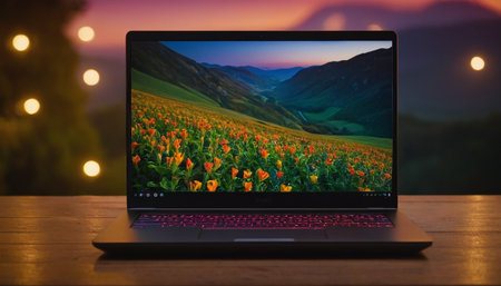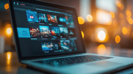 A modern laptop screen showcases creative digital content with a vibrant display, surrounded by soft bokeh lights in the background, creating an inspiring workspace atmosphere.