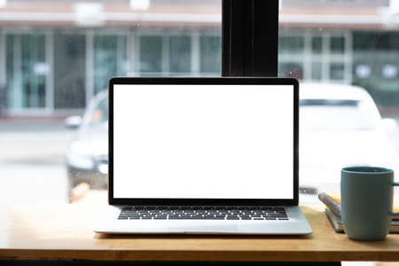 Mockup of laptop computer with empty screen with coffee cup and smartphone on table of the coffee shop background,White screen