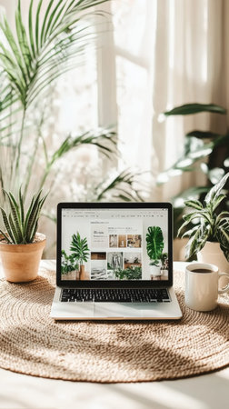 Open laptop displaying an e commerce website featuring houseplants sits on a table with a cup of coffee and various potted plants in a sunlit home office, creating a cozy and productive workspace