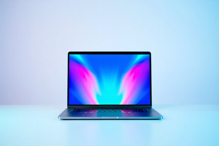 Laptop computer with colorful wallpaper. Vibrant screen display. Bright studio background. Technology device.
