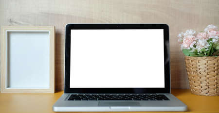 Laptop computer with blank screen on wooden desk isolated on white background