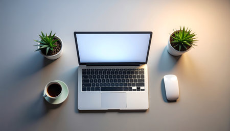 Overhead view of a modern workstation featuring a laptop with a blank screen, a cup of coffee, and two potted succulent plants on a clean grey desk, illuminated by warm light