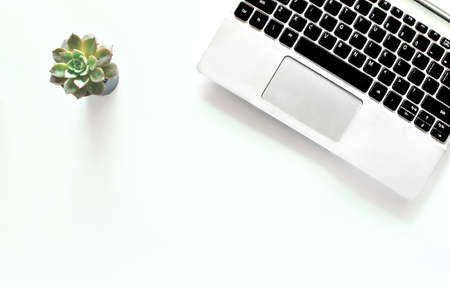 White technological background. top view copy space.Laptop computer on a wooden desk.