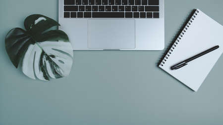 Top view laptop, notebook, coffee cup and potted plant on green background with copy space.