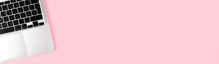 Modern laptop flat lay pink banner background. notebook keyboard. Office workplace table, minimal design concept. top view, copy space