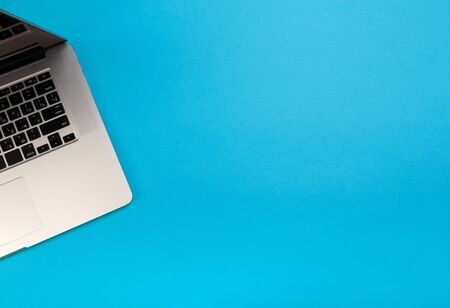 Laptop flat lay blue background. Office workspace table, minimal design concept. top view, copy space