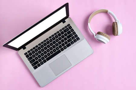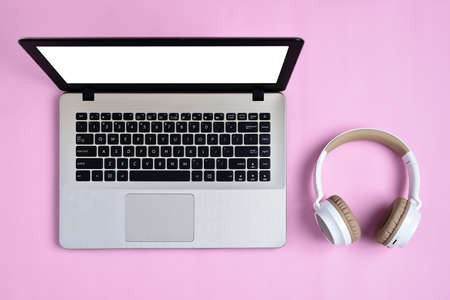 Top View Flatlay of modern wireless headphone and minimalist laptop with white screen on pink color workspace