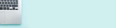 Keyboard laptop computer isolated on blue pastel desk background. Modern Information technology and sofware advances. Freelance home office programmer or designer workspace concept. Copy space banner