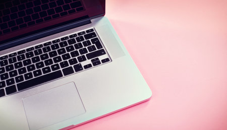 Modern laptop on pink background with copyspace. Office desktop. Top view