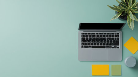 A clean and modern workspace featuring a laptop, sticky notes, and a coffee cup alongside a vibrant potted plant on a mint green surface. Ideal for creative projects.