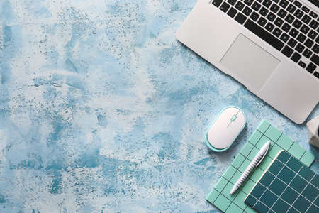 Laptop and wireless mouse on pink and blue background. copy space. top view.