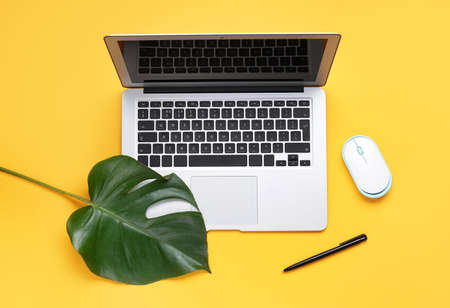 Laptop with palm leaf, pen and computer mouse on yellow background