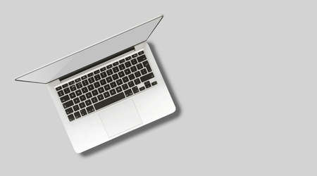 Modern laptop flat lay silver background. notebook keyboard. Office workplace table, minimal design concept. top view, copy space
