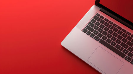 Modern laptop computer on vibrant red and pink background with empty space, top view technology concept for copywriting