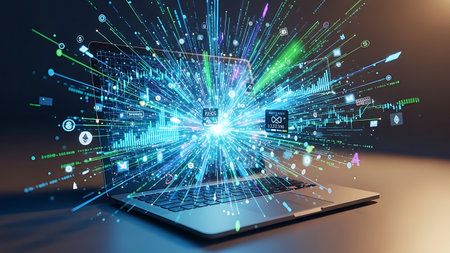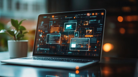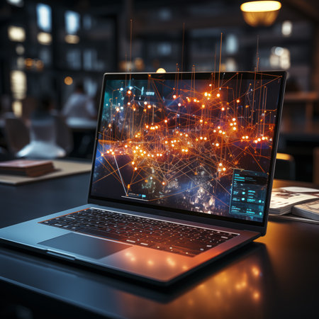 A sleek laptop sits on a wooden desk illuminated by soft ambient light. The screen showcases a vibrant interface filled with graphs, data points, and digital elements.