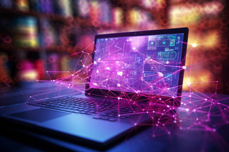 Neon Network Abstract Laptop with Glowing Nodes, Cybersecurity and Connectivity Concept