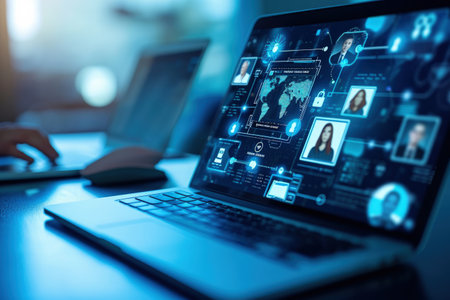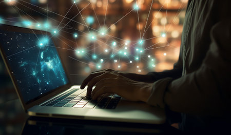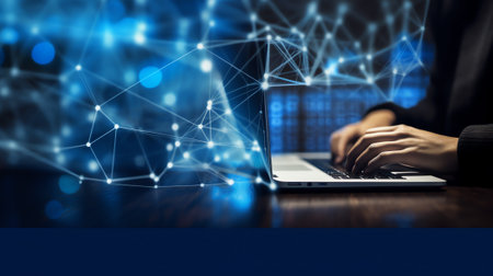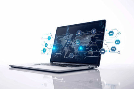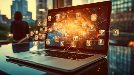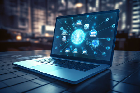 Modern laptop connects wirelessly, communicating data for global business network generated by artificial intelligence