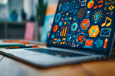A vibrant laptop keyboard illuminated by colorful icons and neon lights creates a modern tech environment perfect for creative professionals and digital enthusiasts.