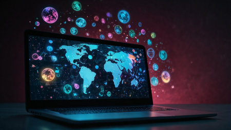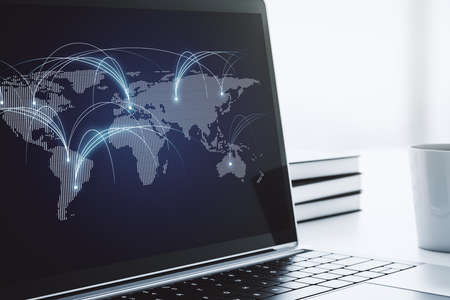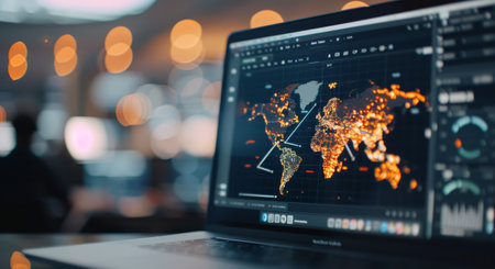 A laptop displays a detailed world map with illuminated data points and graphs, set in a contemporary workspace filled with soft, ambient lighting. The atmosphere conveys a focus on technology and global connectivity.
