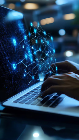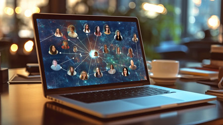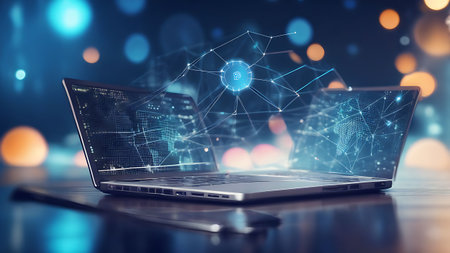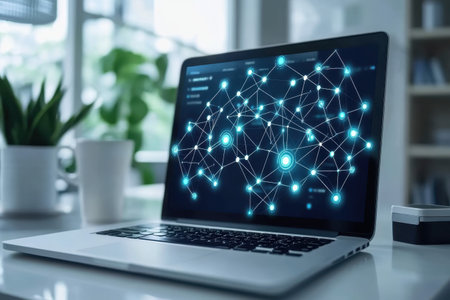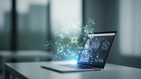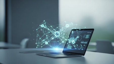 This image showcases a laptop displaying data connectivity and intricate network visualizations above its screen, set in a modern workspace environment.
