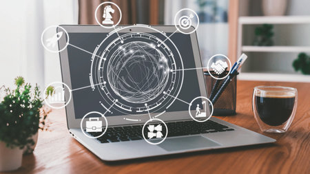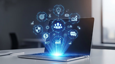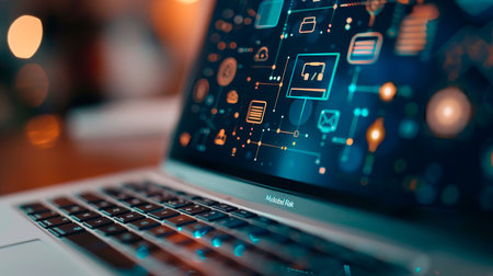 A laptop displays a digital array of icons representing business concepts. The image features a blue color scheme with a blurred background. This illustration is suitable for technology, finance, and business-related projects. It can be used for various commercial or editorial purposes.