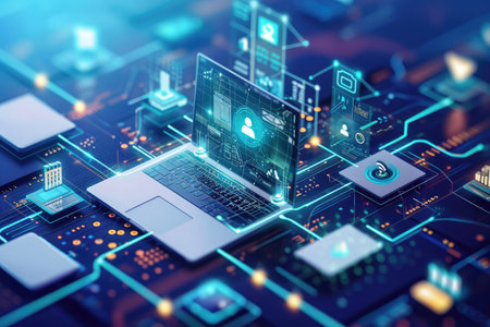 This photo shows a detailed view of a laptop placed directly on a circuit board, Data flowing from a computer to multiple devices in a smart home setting, AI Generated