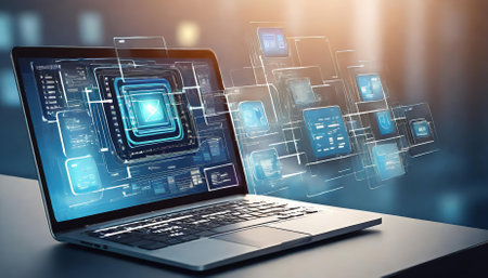 A laptop on a futuristic desk displaying holographic data and digital elements, symbolizing technology and innovation. The image highlights the advancement in digital connectivity and computing.