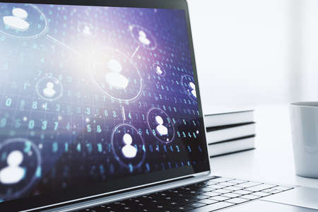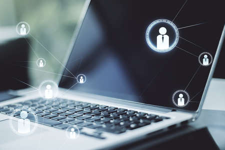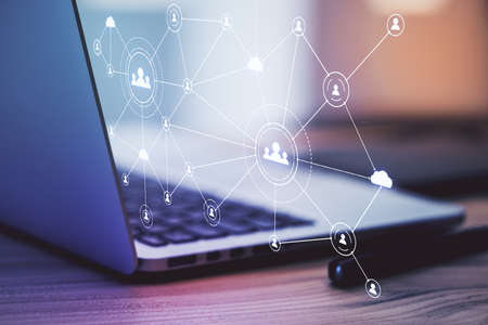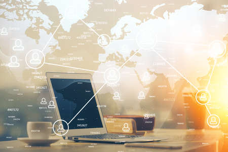 Computer on desktop with social network hologram. Double exposure. Concept of international people connections.