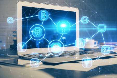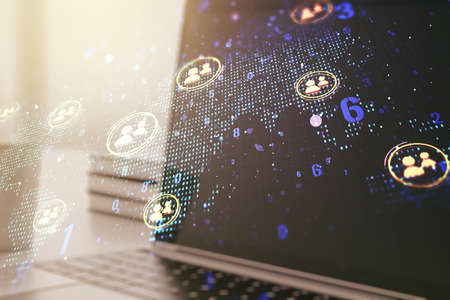 Double exposure of social network icons concept with modern laptop on background. Marketing and promotion concept