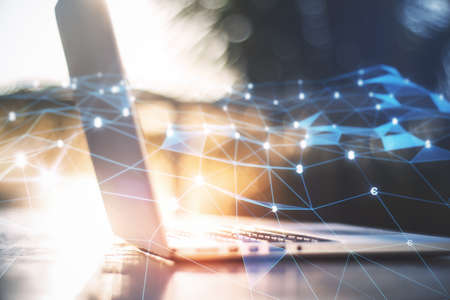 Close up of laptop with creative glowing polygonal mesh on blurry outdoor background. Innovation and technology concept. Double exposure