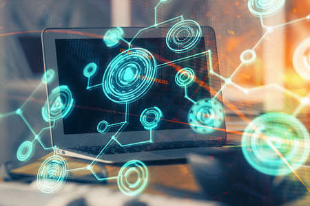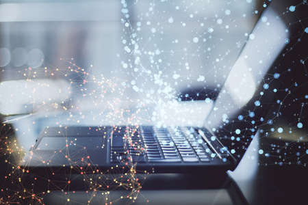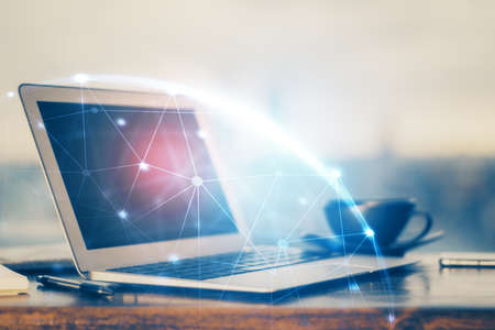 Close up of laptop on desktop with abstract polygonal spheres on blurry office background. Futuristic network and technology concept. Double exposure