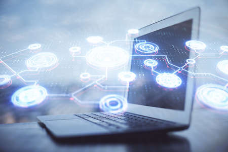 Laptop with abstract network hologram. Technology and communication concept. 3D Rendering