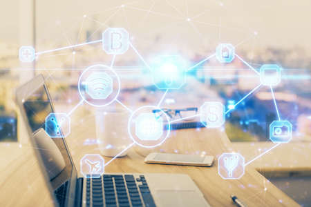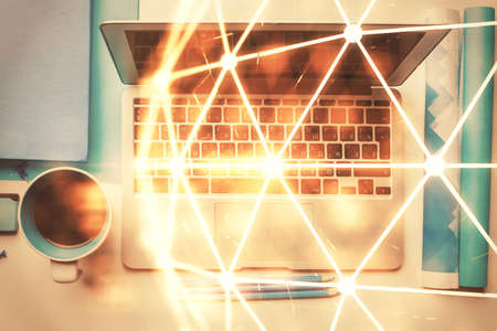 Social network hologram drawings over computer on the desktop background. Top view. Multi exposure. Concept of people connection.