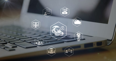 Image of digital interface with icons and globe of network of connections over laptop. Global computer network technology concept digitally generated image.