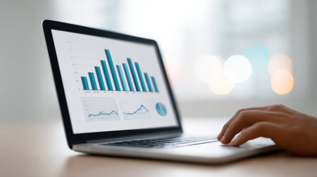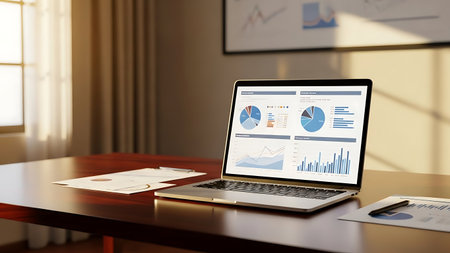 A modern laptop showcases various data visualizations in a bright office setting. The clean layout emphasizes productivity and digital innovation in a professional space.