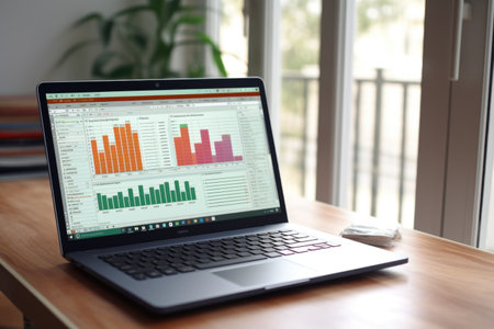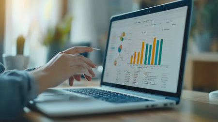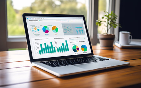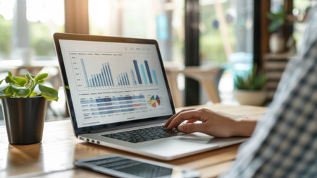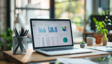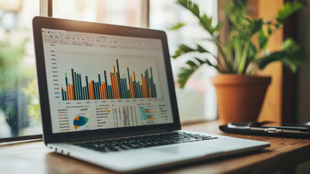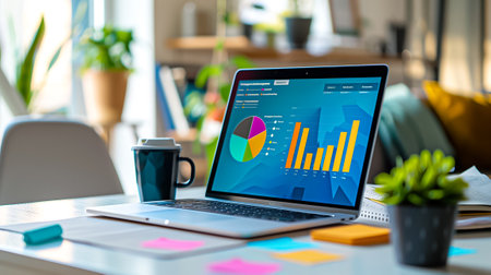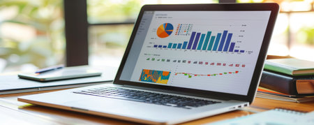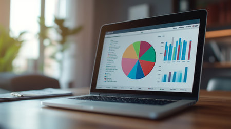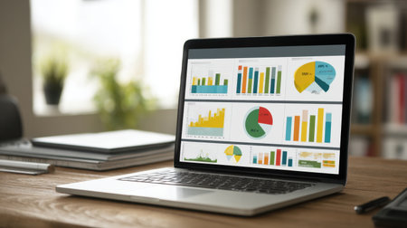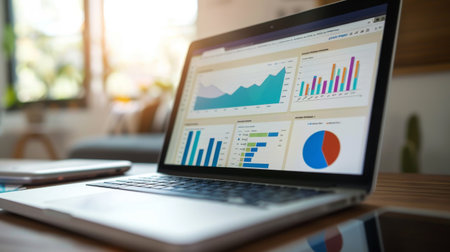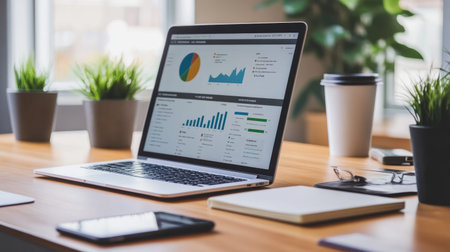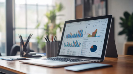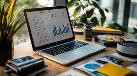 A sleek laptop shows vibrant graphs and charts on a wooden desk in a light-filled office, creating a productive environment ideal for data analysis and planning.