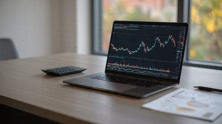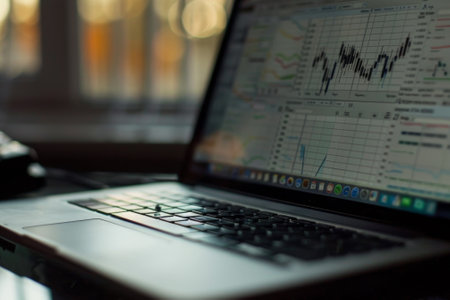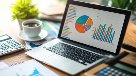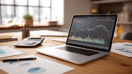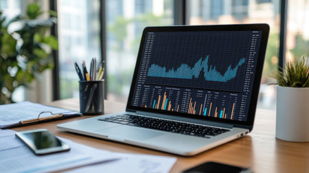 A laptop on a desk with financial graphs and data visualizations on the screen, surrounded by documents and a smartphone. Bright, professional workspace.
