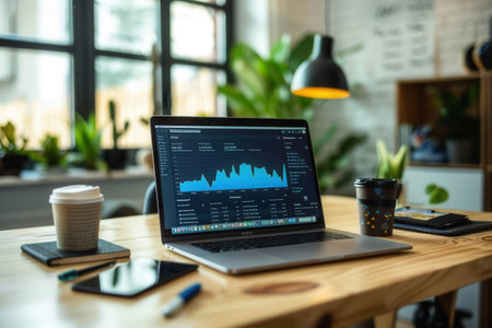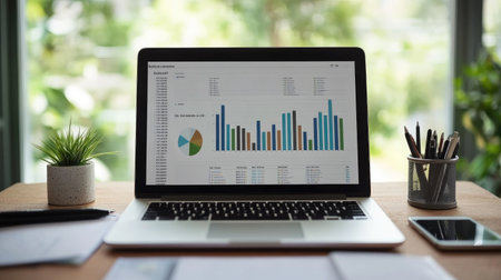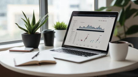 Contemporary workspace highlighting a laptop with data analytics open on the screen, surrounded by plants and office essentials, conveying a productive atmosphere.