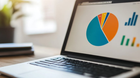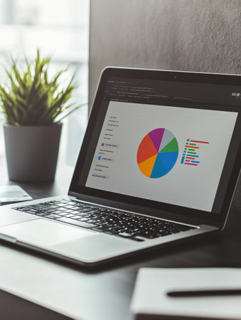 A sleek laptop is open on a minimal desk showing a vibrant pie chart while a small plant adds freshness to the workspace at daylight.